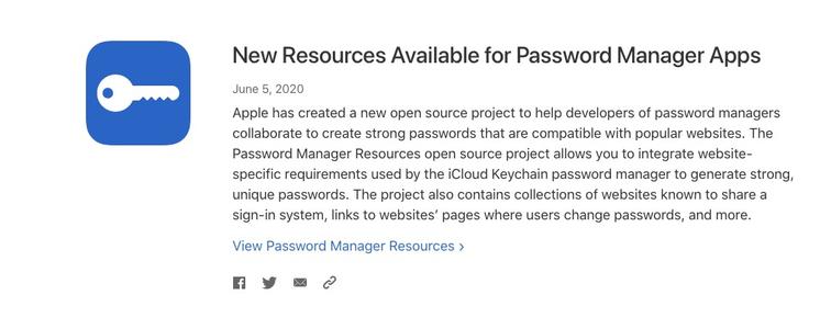 所謂的“密碼管理器資源”計劃是Apple的幾個開源項目之一,該計劃允許密碼管理器應(yīng)用程序?qū)Cloud Keychain密碼管理器使用的網(wǎng)站的特定要求集成到自己的應(yīng)用程序中。Apple的目標(biāo)是允許加密應(yīng)用程序開發(fā)人員在開發(fā)資源上進(jìn)行協(xié)作,以提高質(zhì)量,記錄特定于站點的行為并提高用戶信任度。
